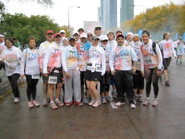 Last Sunday, we gathered together to participate in The Color Run in memory of a very special running buddy – Elyse Barson whom we lost last month to breast cancer. A race where you start with a clean slate (white shirt) and every mile get sprayed with a rainbow of color.